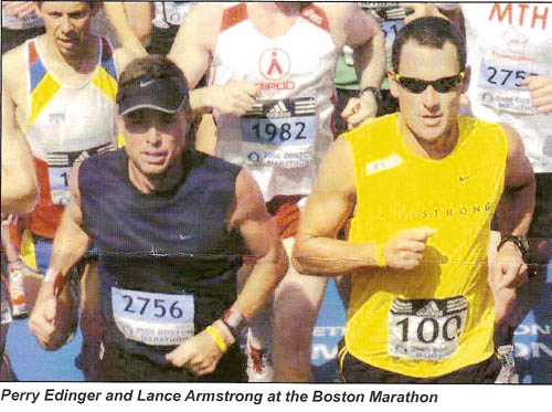 Earlier this year Edinger had the honor of 'pacing' Lance Armstrong during the Boston Marathon. Through a connection with Nike, Edinger was paired with the famed Tour de France champion to make sure he was "taken care of during the race. "The whole Boston Marathon weekend" was amazing... you were treated like a rock star. But during the run was challenging because there were so many people yelling and screaming at him as he ran by. I would go over and get water at the check points because it wasn't safe for him to do that...people trying to run with him, up on his heels. He's a great guy so it was a very, good experience."