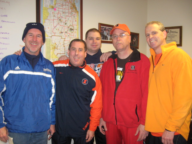 Pre-race strategy meeting in the office of Mike Hatfield (79) long time successful Development (Fund Raising..PR) Officer in the U of ILL Athletic Department. (L to R) John McInerney (79) to runners: Bill Reimer (80), Drew VanVorren (former EIU student and Dave’s son) Dave Van Vorren (78 )...that’s his “game face” and confident Mike (note the All-American Certificate on his wall.