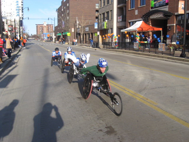 A beautiful sight, the top four wheel chair racers drafting through at a great pace.