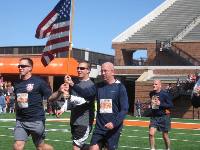 “Old Glory” got quite a reception when these men brought her across the finish line in the football stadium