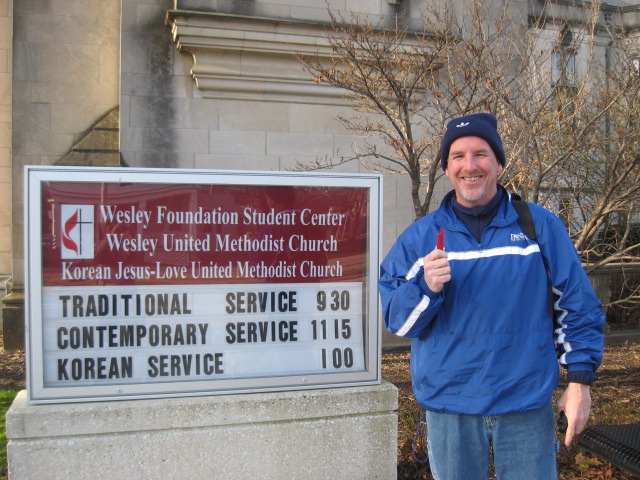 Originally, I thought there would be a great deal of historical significance in the following picture but I goofed. I was thinking that both Dr. Pat O’Brien ...EIU Coaching Icon (2nd marriage) and Dike /Roxie Stirrett were married at this church so many years ago. Actually, it was a Methodist Church about 3 blocks to the east. Nonetheless, I’ll include the picture because it provided a good parking place along Green Street (a major running route for all races). Mac and I were nibbling on some “red licorice” (never eat it but what I think about smuggling the stuff into Dike Stirrett’s hospital room (1969) while he lay on an ice blanket trying to recover from a 105 degree heat stroke situation following his Panther Pant finish. All he wanted to eat was red licorice and of course that was not on the doctor’s list. He still likes the stuff.