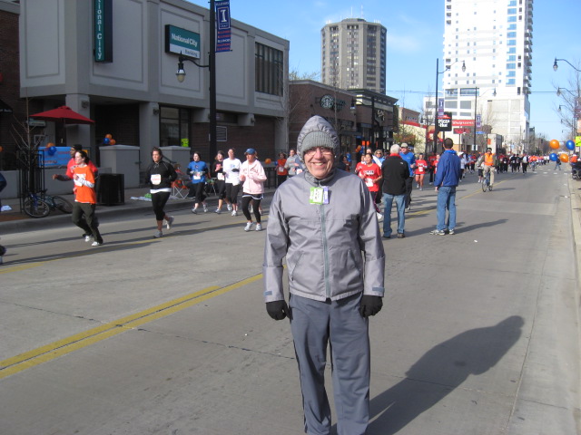 Bill Reimer (80) is a long time Champaign native. He decided to train fairly hard for this event and the results document his efforts. He ran 21:42 (6:59) and finished 2nd of 51 in his 50-54 age group. Here he is giving “papal” blessings to the crowd at mile 1.5