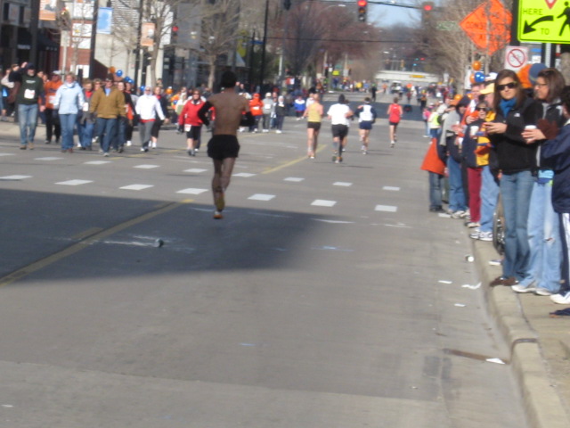But then, along comes a guy (who eventually finished 4th in the marathon) with no shirt. I actually saw him dump cold water on his “head”. Something is wrong with one of us.....