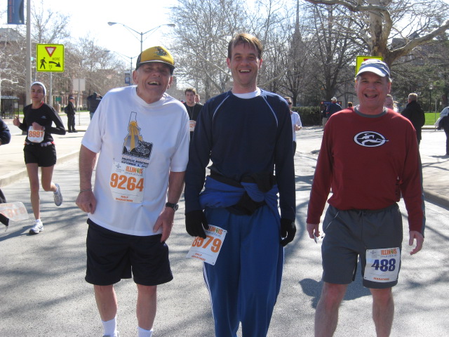 Dr. Jake Emmett (EIU Faculty member since 1990) is shown (far right) with two other EIU faculty associates at about the 10 mile mark. Jake has at least 2 dozen marathons under his belt, and here he is pacing/helping two friends in route to 4:26:49 (10:11) ..83rd of 125 in his 50 – 54 age bracket. From L to R (Dr. Cal Smith 73 yrs...EIU retired Speech and multi-marathon participant. He ran the 1/2 marathon with Dr. Tony Oliver (current EIU teacher ..35+ yrs.)